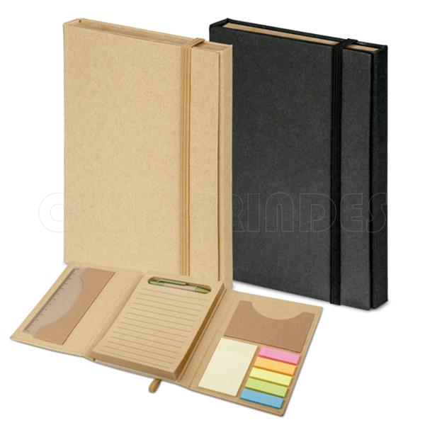 Kit para escritório. Cartão. Com caderno (80 folhas pautadas em papel reciclado), 6 blocos adesivados (25 folhas cada), 1 régua de 12 cm, 1 esferográfica em papel kraft e suporte para cartões de visita. Gravação da logomarca em 1 cor já inclusa.