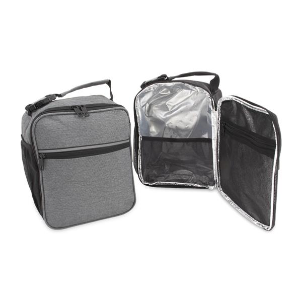 Bolsa térmica de nylon com dois compartimentos, capacidade de 8 litros. Com bolso telado e tela média de proteção interna, a bolsa possui uma faixa frontal refletiva, bolso lateral telado e alça de mão com fivela de encaixe. Gravação da logomarca em 1 cor já inclusa.