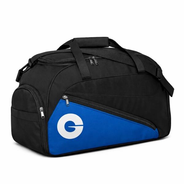 Bolsa Esportiva em Poliéster com bolsos laterais e frontal, alça de mão e alça de ombro regulável e removível. Disponível em várias cores. Gravação da logomarca em 1 cor já inclusa.