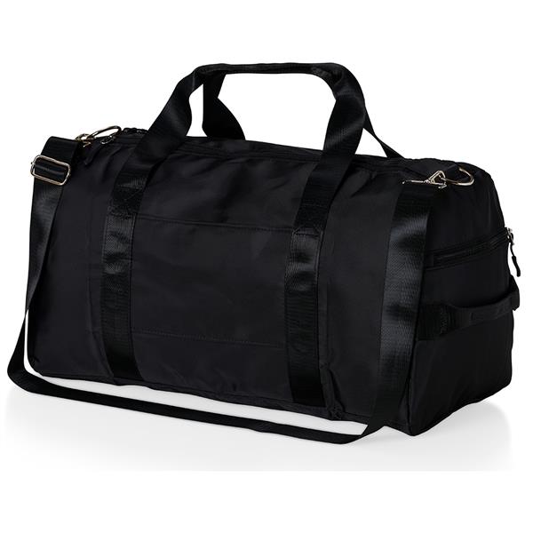 Bolsa esportiva de 36 litros em poliéster resistente à água com cinco compartimentos, sendo dois deles exclusivos para tênis e itens molhados. Contém bolso para encaixe em malas de viagem, bolso interno, alça de mão lateral extra e acompanha alça transversal. Gravação da logomarca em 1 cor já inclusa.