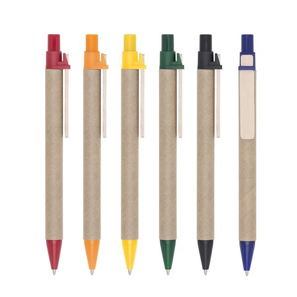 Caneta ecológica de papelão com detalhes coloridos. Possui carga esferográfica azul 1.0 mm, clip de madeira e ponteira plástica com relevo. Acionamento por clique. Gravação da logomarca em 1 cor já inclusa.