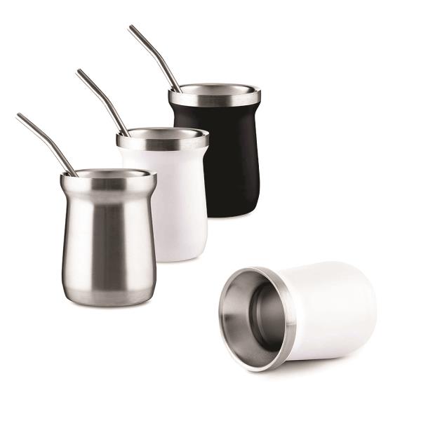 Cuia térmica em inox com capacidade para até 250ml. Possui estrutura de parede dupla, que permite conservar a temperatura de líquidos por mais tempo sem transferir a sensação de frio ou calor para a parede externa. Acompanha canudo bomba em inox. Gravação da logomarca a laser já incluso.