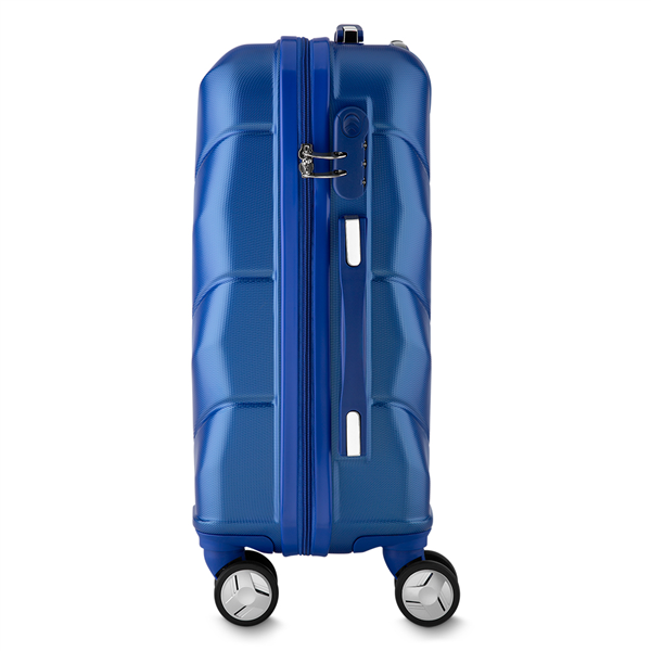Mala viagem pequena em ABS (Estireno de acrilonitrilo e butadieno) com interior em poliéster 210D, forro em poliéster. Alça de mão na lateral e na parte superior, sistema de carrinho de aço com 4 rodas de 360 graus. Cadeado com senha/segredo. Gravação da logomarca a laser já incluso.